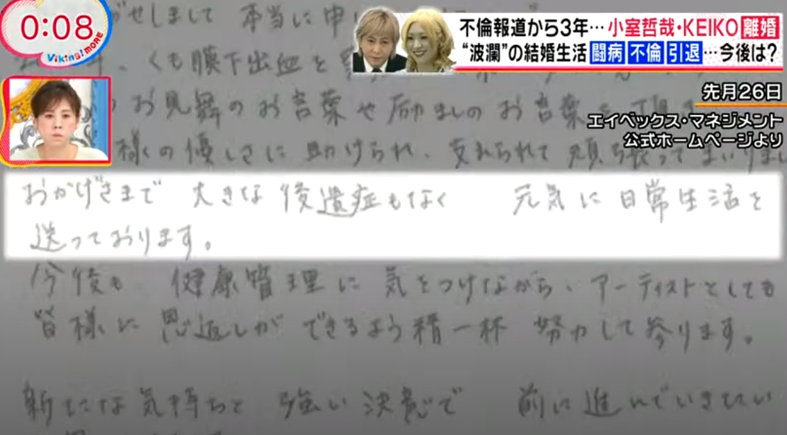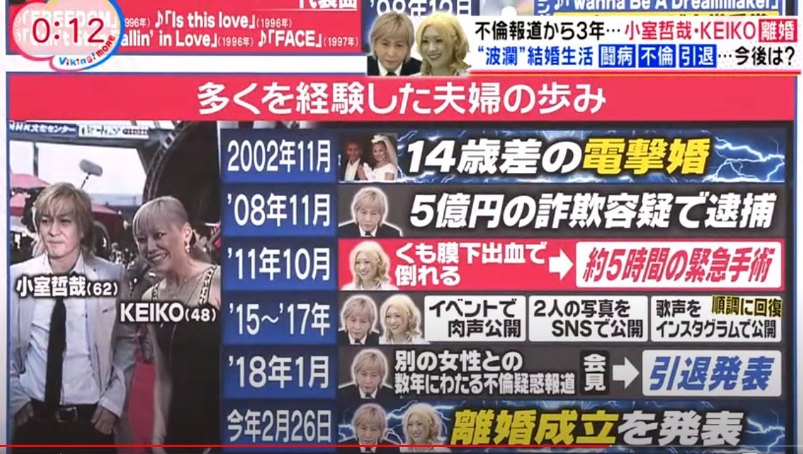 先月末 2月26日に 離婚が成立した小室さんとKEIKOさん。ふたりは、去る2002年11月に結婚したものの、11年に KEIKOさんが ‘くも膜下出血’で倒れることに。その後、18年になって 小室さんが看護師との不倫が報じられると、小室さんは記者会見を開き、不倫関係を否定。その上で、KEIKOさんについて「高次脳機能障害」「小学4年生の漢字ドリルを楽しんでやってる」などと明かしつつ、騒動の責任を取って引退することを発表していたのでした。