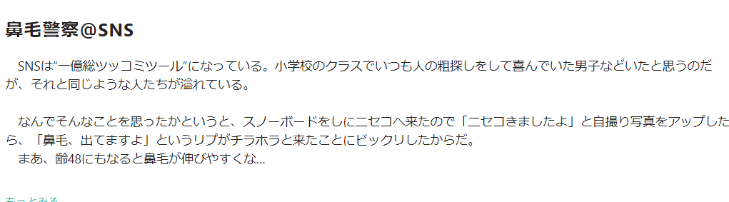 その冒頭には…《SNSは〝一億総ツッコミツール〟になっている。小学校のクラスでいつも人の粗探しをして喜んでいた男子などいたと思うのだが、それと同じような人たちが溢れている》《「鼻毛、出てますよ」というリプがチラホラと来たことにビックリした》《鼻毛のケア、例えば鏡を見て手入れしてから自撮りするなんて女子みたいなことをオッサンがしているわけないじゃんと思うのだ。それでも、〝鼻毛〟警察はやってくる(笑)》といった文章が見られます。