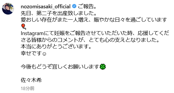 今回報じられたのは第2子出産の報告です。