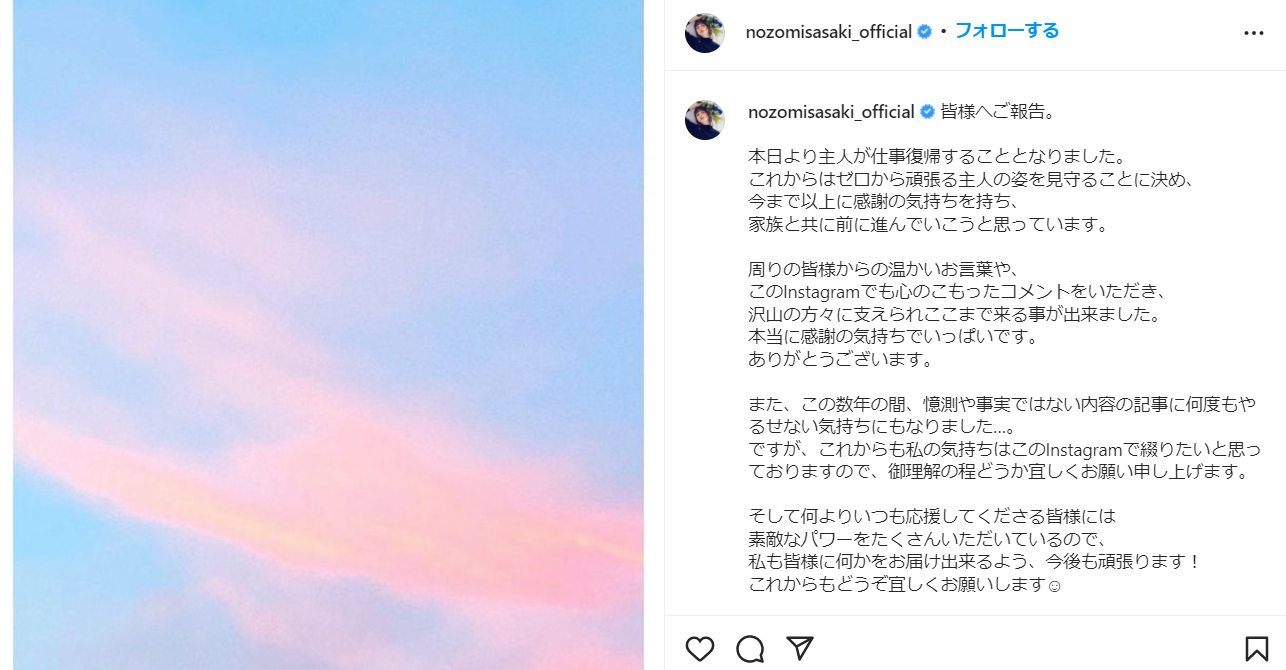 今回、佐々木さんは自身のインスタグラムに、「これからはゼロから頑張る主人の姿を見守ることに決め、今まで以上に感謝の気持ちを持ち、家族と共に前に進んでいこうと思っています」と投稿しています。