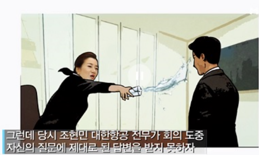 聯合ニュースなどは、ヒョンミン氏が大韓航空本社の会議で、質問に答えられなかった広告会社員の顔に水をぶちまけたと報じたのです。