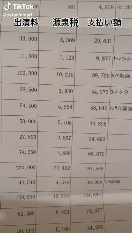 単価は22万円から11円とピンからキリまであり、見えている範囲だけ計算すると“源泉徴収前の収入”は約96万円。発注元などについては伏せているものの、出演料や源泉税、差し引かれた支払総額を赤裸々に披露していました。