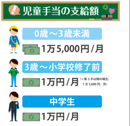 〝児童手当制度〟とは、中学生以下の子ども1人につき決められた額が保護者に対し、毎月支給されるというもの。3歳未満は一律1万5000円、3歳以上小学校修了前は1万円(第3子以降は1万5000円)、中学生は一律1万円を支給。