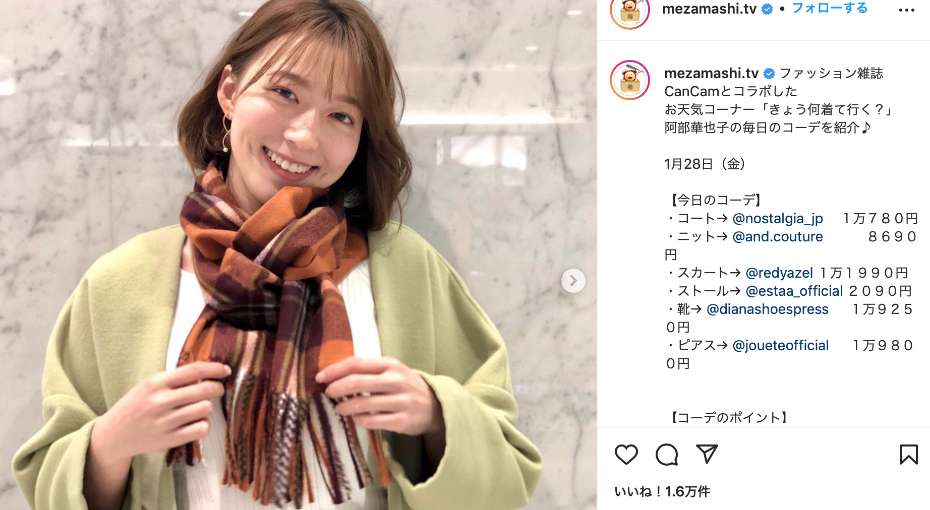 『めざましテレビ』(フジテレビ系)の公式アカウントがSNS(インスタグラム)を更新し、同番組のお天気キャスターを務める阿部華也子の衣装を紹介しました。