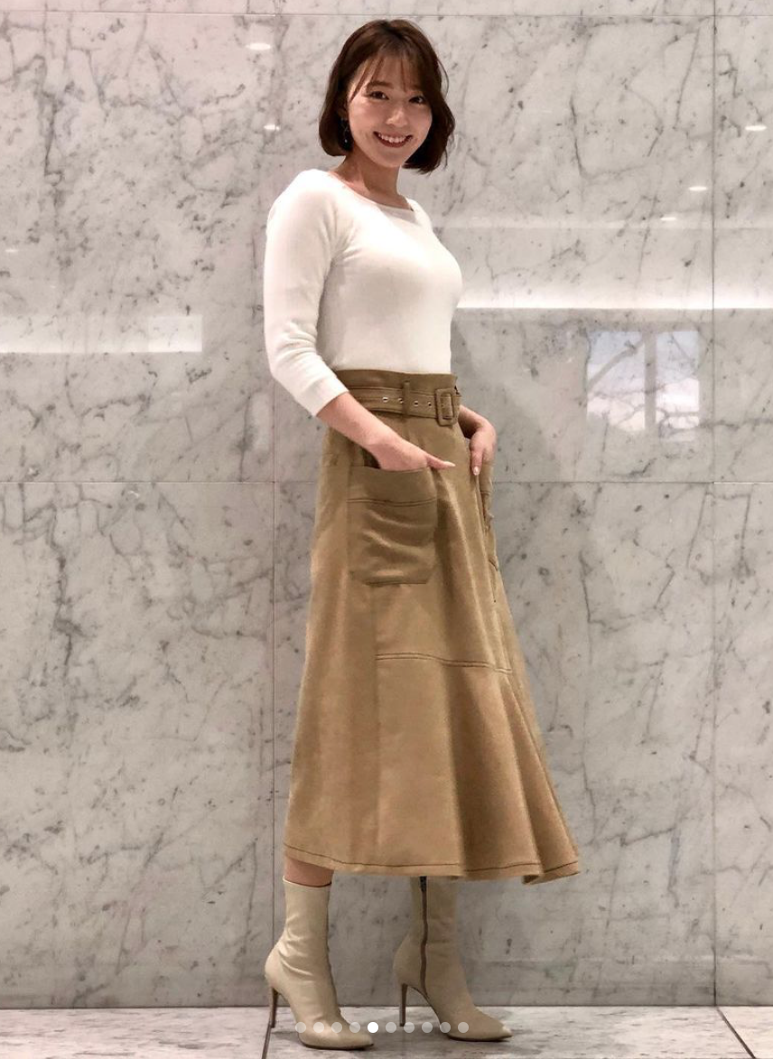 ファッション雑誌CanCamとコラボしたお天気コーナー「きょう何着て行く?」で阿部は、変形フレアシルエットのスカートが存在感たっぷりなコーディネートを披露しています。