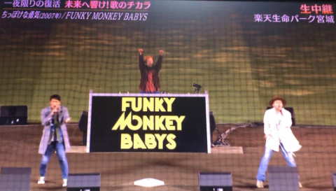 番組ではファンモンの代表曲『あとひとつ』『ありがとう』『ちっぽけな勇気』を熱唱。ボーカルのファンキー加藤は「ほんとうにすてきな舞台でした。東北の空の下で歌うことが出来て幸せでした」とコメント。