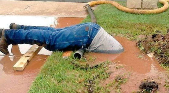 もしここで諦めても誰も非難しないような劣悪な状況。しかし、配管工ははばかることなく自分の体を水たまりの中に埋め込んでいった。
