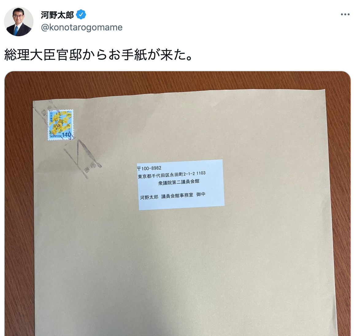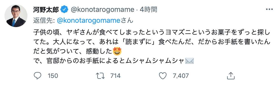 「総理大臣官邸からお手紙が来た」と、官邸から届いた封筒の写真を投稿した河野氏。ふと思い出したことがあったようで、「子供の頃、ヤギさんが食べてしまったというヨマズニというお菓子をずっと探してた。大人になって、あれは『読まずに』食べたんだ、だからお手紙を書いたんだと気がついて、感動した」とつづりました。
