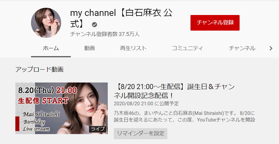 乃木坂46の白石麻衣さんが、8月18日、自身のYouTubeチャンネルを開設したことを、乃木坂46のオフィシャルウェブサイトで発表されました!初回は、白石さんの誕生日である、20日の21時から生配信を実施する予定とのことです!!