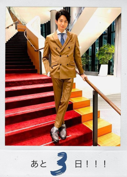 スマートなスーツを着用した向井さんの姿が。階段の手すりに寄りかかりながら右手をポケットに入れて、ブラウンのスーツ姿で男前なポーズを決めています。
