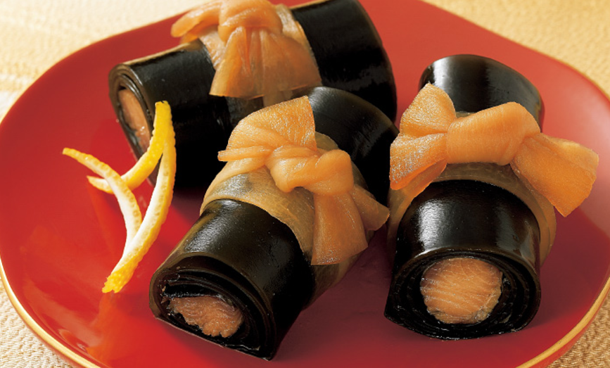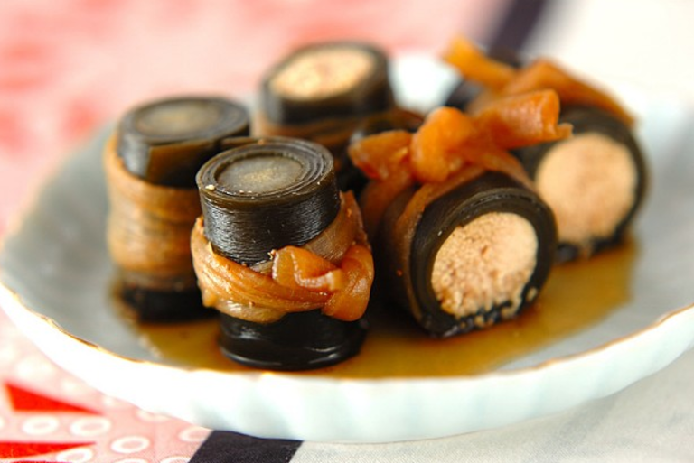 昆布巻きは昆布とニシンの漁獲量が多かった北海道が発祥の地で、北海道でよく食べられていたニシンの昆布巻きが日本海経由で全国に広まったと言われています。今では正月のおせち料理は欠かせない一品となっていますが、その由来は昆布を「喜ぶ」と「子生婦(こんぶ)」と言う字をあてる語呂合わせにより、一家の幸せと子孫繁栄を祈念する縁起が良い料理としておせち料理の一品になったことは広く知られています。縁起を担ぐ以外にも、昆布には食物繊維が豊富でアルギン酸やフコイダンなどの成分が多く、昆布を食べて健康で長生きを、と言う意味も込められています。