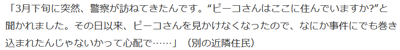 自宅で暮らしているはずのピーコさんも姿が見えなくなっており、