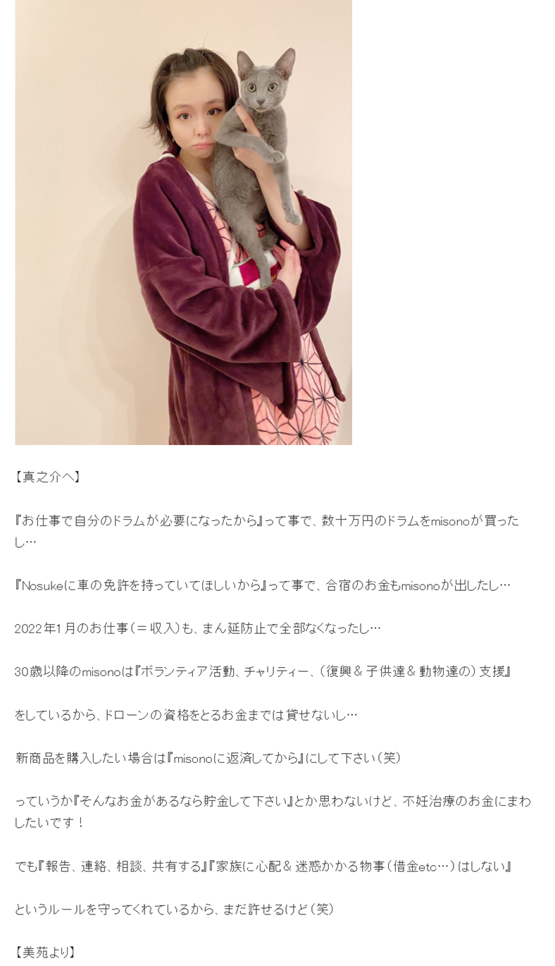 Nosukeのブログに対し、misonoは「『お仕事で自分のドラムが必要になったから』って事で、数十万円のドラムをmisonoが買った」と綴り、「『車の免許を持っていてほしいから』って事で、合宿のお金もmisonoが出した」とNosukeのために費用を負担していたことを告白しました。