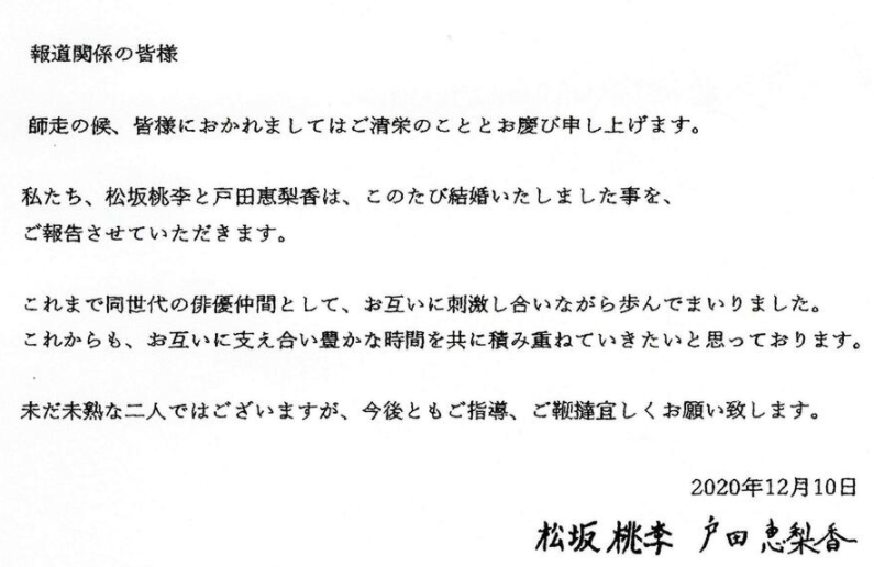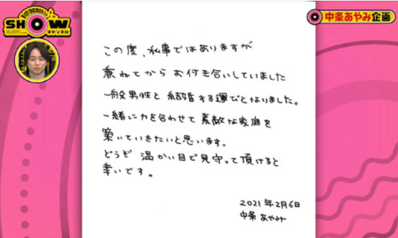 松坂さんは、結婚発表翌日の「スッキリ」を見たそうで、「直筆(の部分)に(カメラが)寄られてて恥ずかしい」とあまり上達しなかったことも明かしました。しかし「ペン習字やっててよかった」とも思ったそうです。