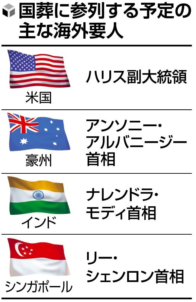 国内では、葬儀委員長を務める岸田総理大臣をはじめとする現職の三権の長と、その経験者が19人。