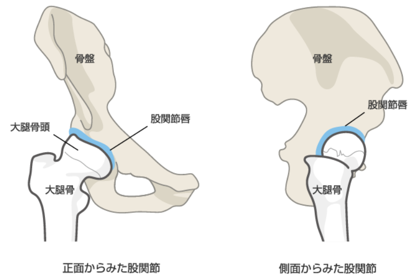 股関節唇とは、骨盤側の寛骨臼の辺縁を取り巻く柔らかい軟骨で、リング状のゴムパッキンのように大腿骨頭を包み込んでいる部分のことです。 大腿骨頭を安定化させ、衝撃吸収の役割を担っています。 関節唇には神経が存在し、損傷を受けると痛みが生じることがあります。 関節唇損傷が生じると骨頭が安定しなくなり、次第に軟骨が破壊され、変形性股関節症へ移行すると考えられています。