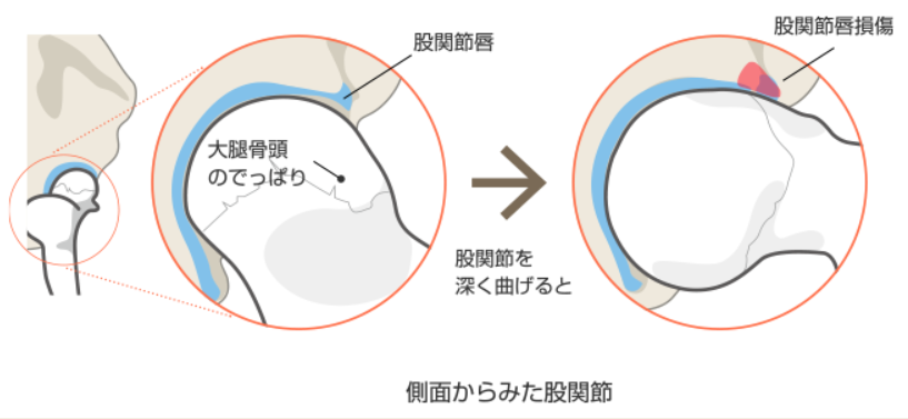股関節唇が損傷を受けると、脚を動かすような動作に痛みが走ったり、引っ掛かり感を感じたりします。日常生活ではあぐらをかくよう姿勢や、股関節を深く曲げた際、内側へ脚を組むような運動時に痛みや違和感が生じることがあります。靴下を履く、爪を切るなどの股関節を深く曲げるような動作、車の乗り降り、椅子から立ち上がる際に痛みや異常感覚を訴えれば、股関節唇損傷の可能性があります。