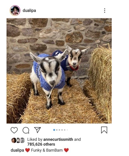 著者は「頭がおかしいんじゃないか」と言いながら写真2枚を掲載しました。公開された写真はドゥア・リパのインスタグラムの掲示物。ドゥア・リパは飼っている2匹の子ヤギの写真を載せ、「Funky & BamBam(ファンキーとベンベン)」と言いながらヤギの名前をアップしました。