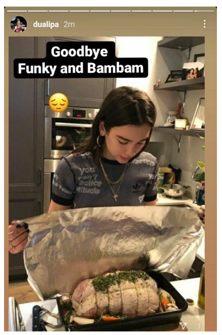 セーターまで着た2匹の子ヤギ。ところが、その後に掲載されたインスタグラムの写真でドゥア・リパは肉の塊をオーブンに入れる写真を載せ、「Goodbye Funky and Bambam(ジャルガ·ファンキーとベンベン)」と書いたのです。前に載せていたペットのヤギの名前を呼びながら、さようならと挨拶をしていたのでした。