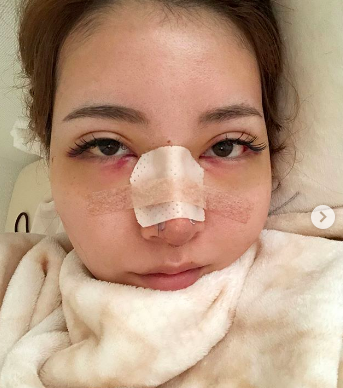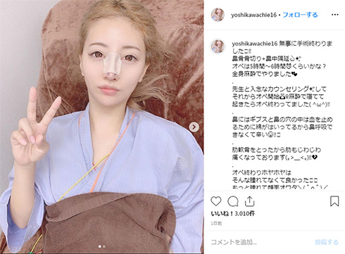 ちえさんは自身のInstagramにギブスで固められ、鼻の中には血を止めるため綿を詰め込まれた鼻がはっきりと分かる術後の写真を投稿し、5~6時間に及んだという手術が無事終わったことを報告しました。Instagramのストーリーズでは、ダウンタイム(施術後の腫れなどが回復するまでの期間)の様子や、今回の手術で230万円を支払ったこと、移植した肋(あばら)軟骨は妹のときと異なり、胸の下から一段下がった場所から取られており、傷跡が残らないか心配する内容も投稿していました。