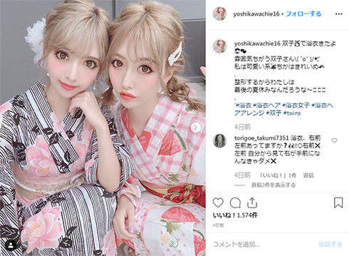 今月7月16日、姉妹で美容整形を公表している双子モデルの姉・吉川ちえさんが、全身麻酔による鼻の美容整形手術を終えたことを報告し、自身のInstagramで経過についてつづりました。その経過については画像つきで紹介しており、直後はかなりいたいたしい姿でしたが、現在はどうなったのでしょうか?