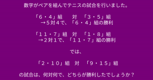 ペアを組んだ数同士を足し合わせ、その数と、対戦相手の数との比を答える問題です。