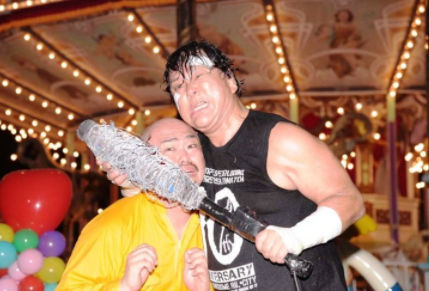 《次は大仁田厚さんと電流爆破有刺鉄線蛍光灯デスマッチです。リングの下は画鋲です》