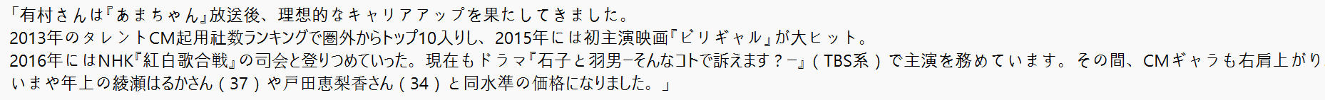 そして、今回注目すべきは、前回から「4000万円増」の“大出世”を果たした有村架純。