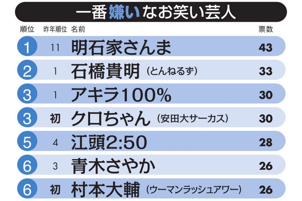 「昨年もさんまさんは2位でした。トップのサンドウィッチマンとの得票数には、2年前よりも開きが見られた。それよりも驚いたのは、『一番嫌いなお笑い芸人』ランキングで、2年前にトップだった石橋貴明(58:とんねるず)を抜いて、トップに躍り出たことです。しかも、嫌いの理由のトップは“ネタがつまらない”だったんです。」