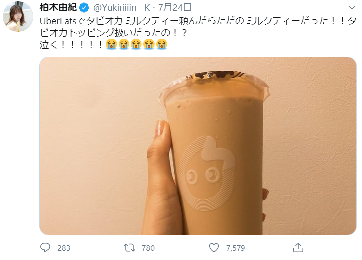 24日、AKB48の柏木由紀さんが自身のツイッターを更新。柏木さんはこの日、ウーバーイーツでタピオカドリンクを注文したと明かしたのですが、ファンからは様々な反響が寄せられているようです!?