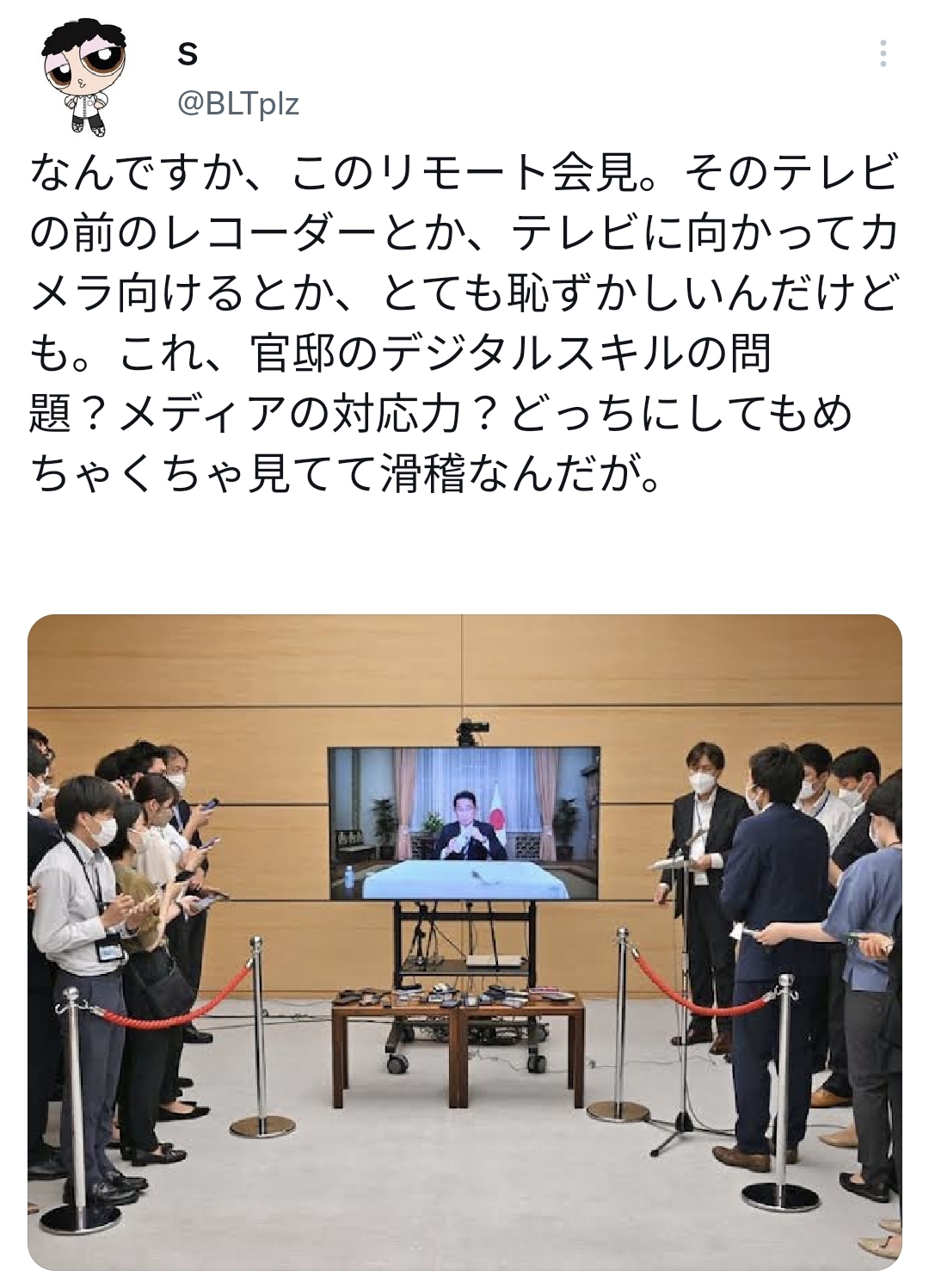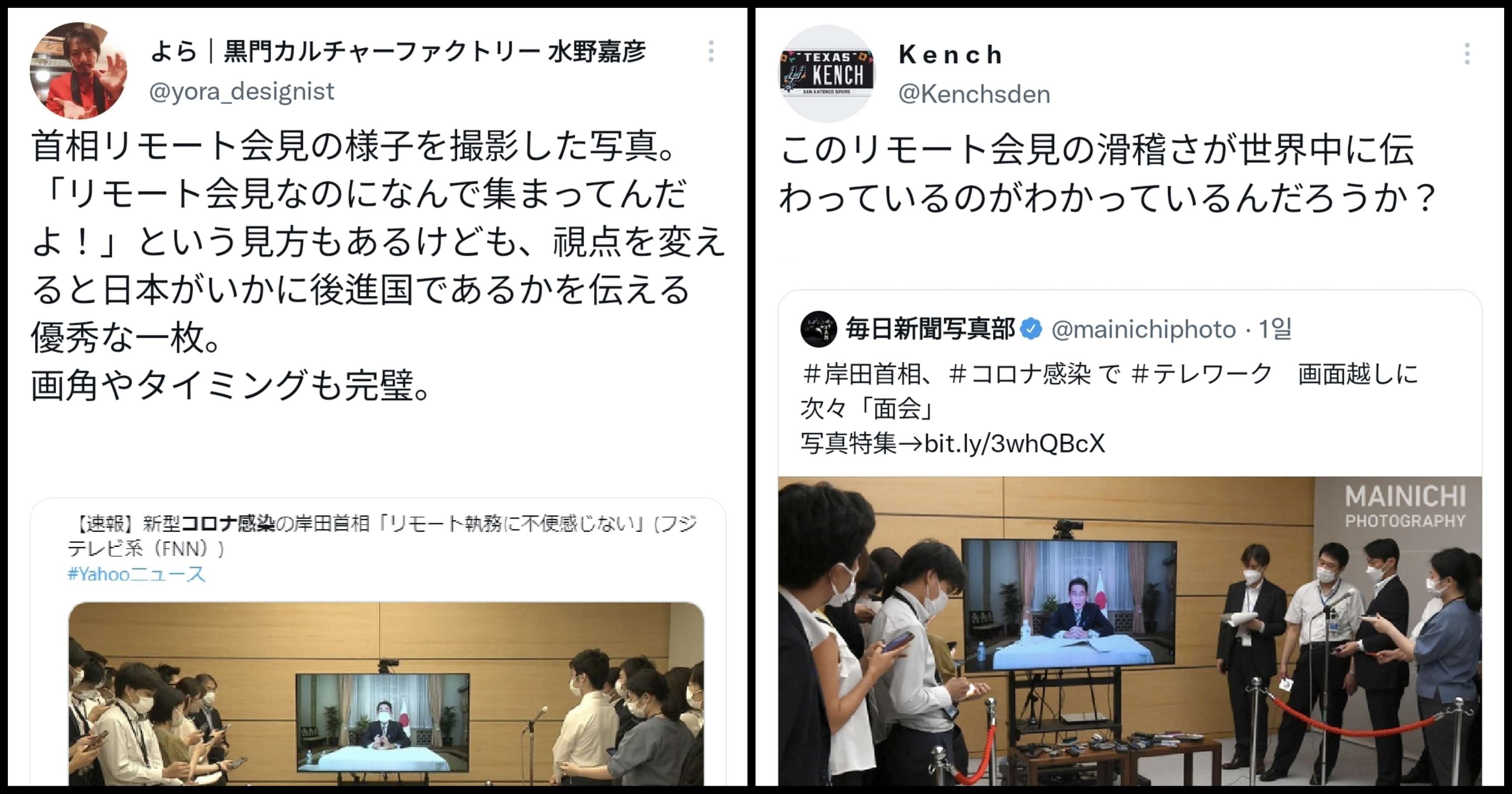 日本のネット民たちからも「コントかよ!」といった突っ込みや、海外に拡散された日本の“最先端リモート会見”を恥ずかしがるコメントが多く集まりました。