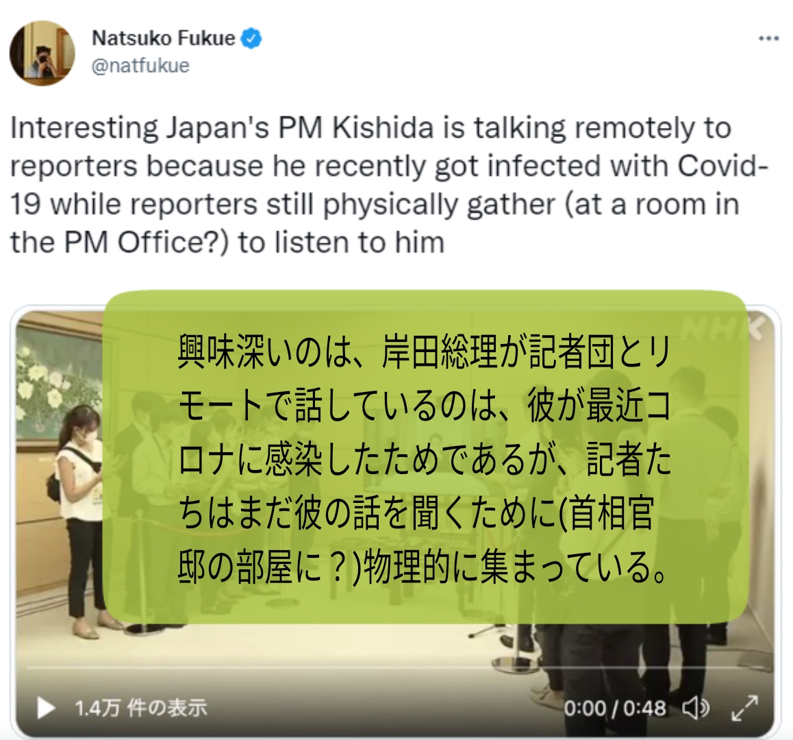そして、岸田総理は記者団に向けてリモート会見を行いました。この様子を海外在住の日本人記者が英語でSNSに拡散しており、海外のネット民から注目を集めています。