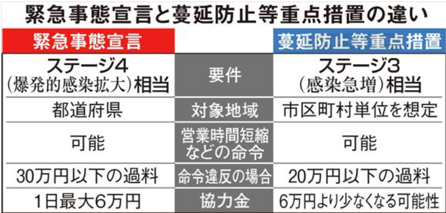 それでは蔓延防止措置と緊急宣言の違いは何でしょう?