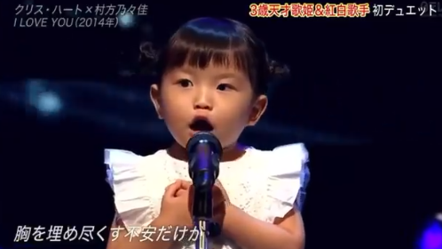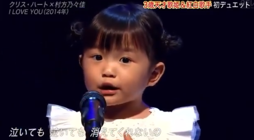 「3歳の歌姫」として話題の村方乃々佳(むらかた・ののか)ちゃんが3日、日本テレビ系音楽特番「THE MUSIC DAY」に初登場。大好きな歌という「I LOVE YOU」をクリス・ハートと初デュエットし話題を集めていました。