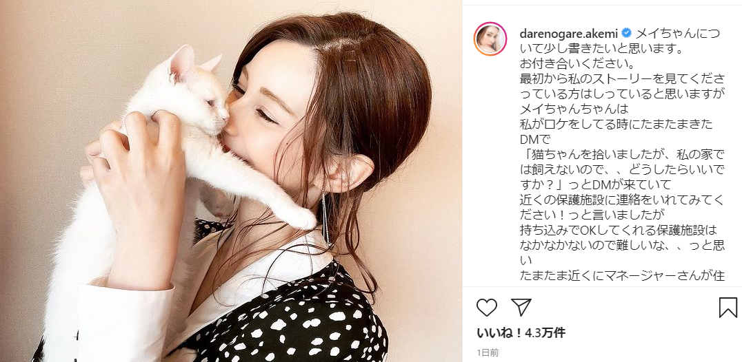 しかし、ダレノガレさんは今回のインスタグラムの投稿では、「メイちゃんについて少し書きたいと思います」と、出会いの日から現在に至るいきさつを あらたまった口調で告白したのでした。