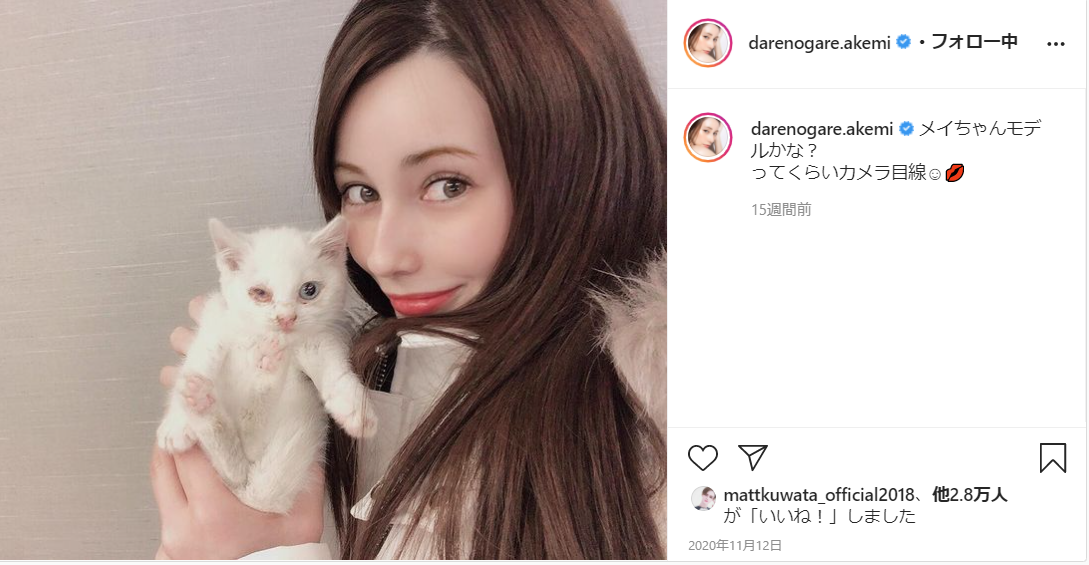 去る2020年11月、ダレノガレさんは 片目にダメージを負っていたメイちゃんを道端で保護したとSNSで報告。動物病院に連れていった後は、ノミ取り、2時間おきの食事、目薬の点眼など懸命な治療と世話を続けており、ある程度体力が回復したら 実家で受け入れてもらえることになったとして、「ダレノガレ家のファミリーになります」とも伝えていました。
