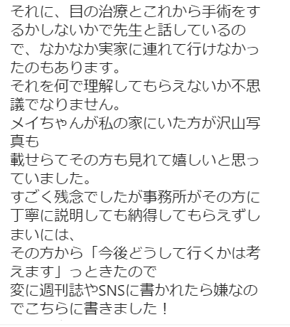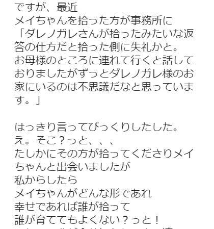 「ダレノガレさんが拾ったみたいな返答の仕方だと拾った側に失礼かと」「お母様のところに連れて行くと話しておりましたがずっとダレノガレ様のお家にいるのは不思議だなと思っています」と、最初の保護者である自分を無視するかのような飼育姿勢と言動の不一致を責めるような調子で 事務所側に伝えてきたとのことでした。