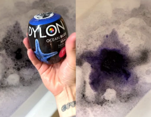 彼は彼女のお気に入りの泡風呂剤にファブリックの染料を混ぜて、湯船に溶かしたのでした。