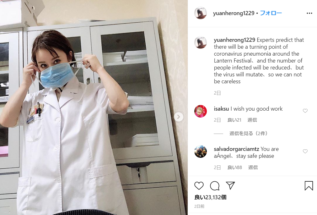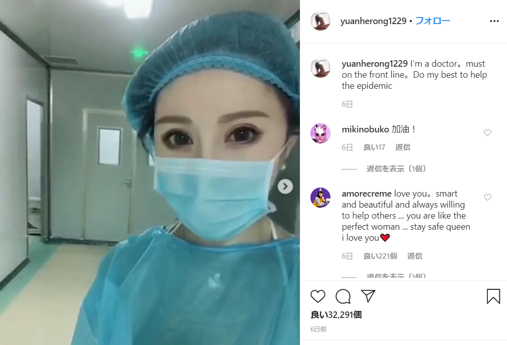 この投稿にはマスクと手術服に身を包んだ写真とともに「私は医者です。最前線にいます。伝染病を助けるためにベストを尽くします」(原文ママ)と報告。