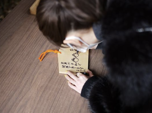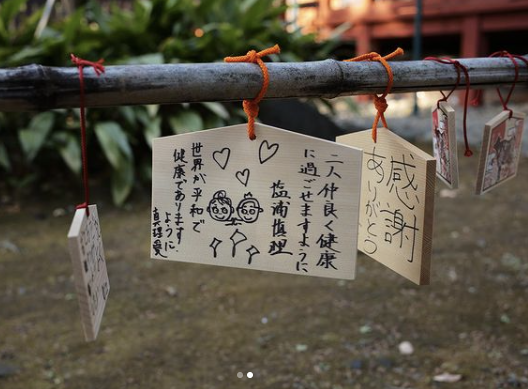 絵馬に塩浦選手は「二人仲良く健康に過ごせますように」、おのさんは「世界が平和で健康でありますように」と願いを記し、名前を書く際、おのさんは本名を添え書き。