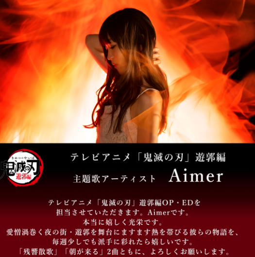 同日、追加キャラ・キャスト情報も発表され、上弦の陸の鬼・堕姫(だき)役は沢城みゆきさんが担当。また、主題歌はAimerが抜擢され、タイトルはOPテーマが「残響散歌」、EDテーマが「朝が来る」となっています。「朝が来る」は『劇場版「鬼滅の刃」無限列車編』の主題歌「炎」を手掛けた梶浦由記氏が楽曲提供しているそうです。