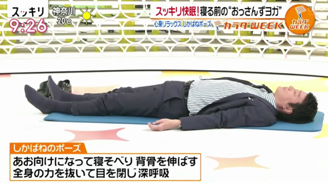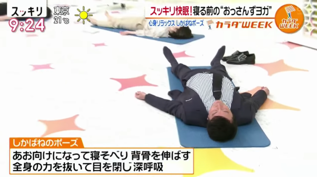 この「しかばねのポーズ」を実践した加藤さん。すると、加藤さんはその姿勢のまま微動だにせず、なんとも心地よさそうな様子のまま番組は一旦CMへ…