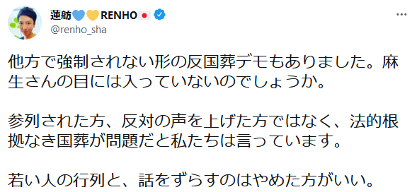 国葬が終わっても黙ってはいられない蓮舫氏なのでした。