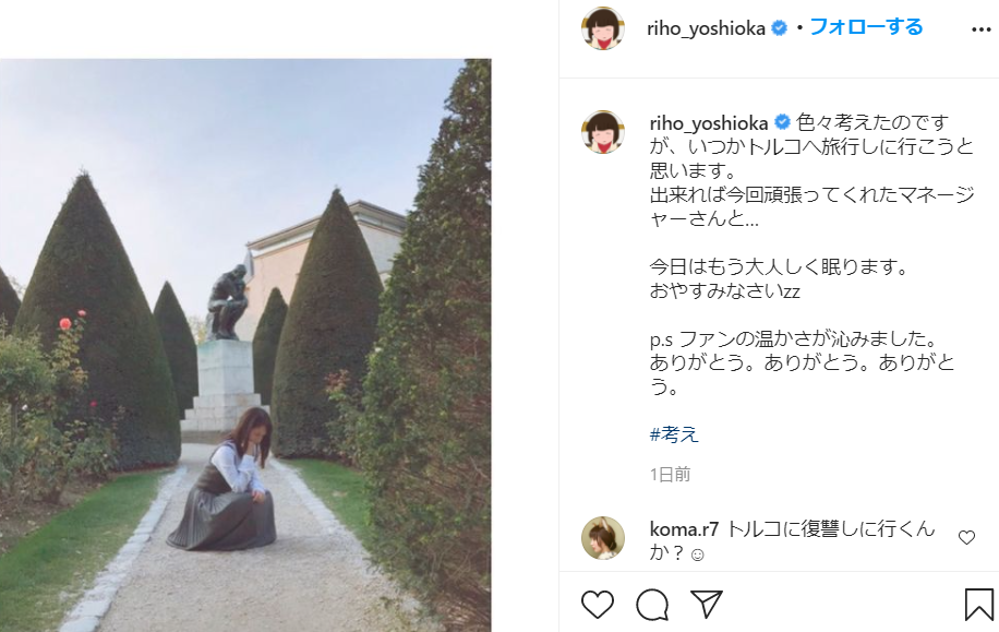 今回、おそらく吉岡さんのアカウントと知らずに乗っ取ったと思われますが、吉岡さんは《いつかトルコへ旅行しに行こうと思います。》とポジティブにコメントし、寛容さを見せています。