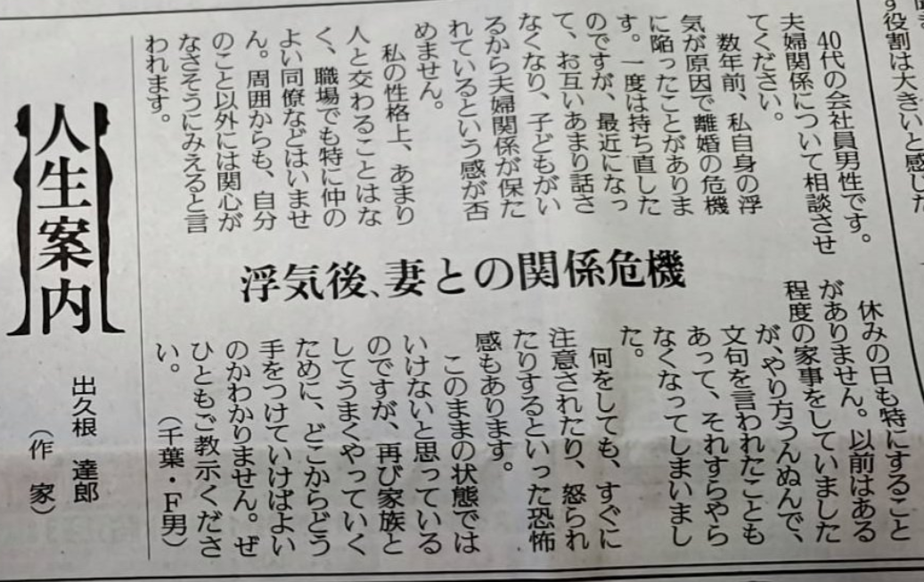 今日ご紹介するのは妻と上手く行っていない男性の方からのお悩み相談です。事の原因は自身の浮気が発端のようですよ。一体どんな話が待っているのでしょうか。詳しく見ていきましょう。