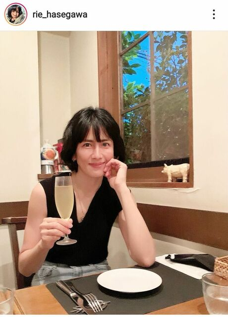 長谷川は黒髪のボブヘアに黒のノースリーブを着て、グラスを持ったショットを投稿しました。