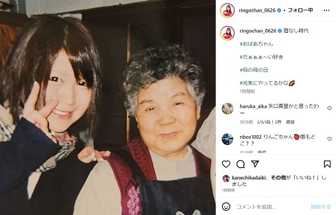 りんごちゃんは「眉なし時代#おばあちゃん#だぁぁぁ~い好き#母の母の日#お空の上で元気にやってるかな」とつづり、高校生時代に撮影したと思われる、亡き祖母と笑顔の2ショット写真を投稿しました。