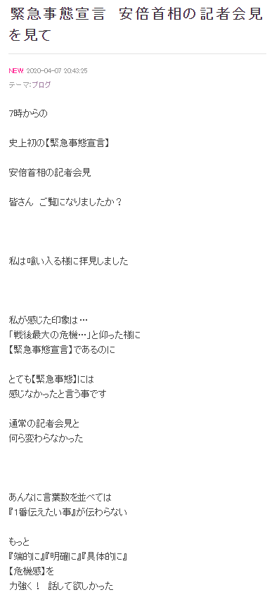これを受け、歌手の小柳ルミ子(67)さんが 自身のブログを更新。安倍首相の会見を「喰い入る様に拝見しました」と振り返り「私が感じた印象は…『戦後最大の危機…』と仰った様に【緊急事態宣言】であるのにとても【緊急事態】には感じなかったと言う事です」とバッサリ⁉。