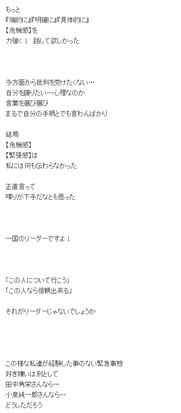 「この様な私達が経験した事のない緊急事態 好き嫌いは別として田中角栄さんなら…小泉純一郎さんなら…どうしただろう」と斬り捨てました。