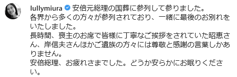 27日行われた安倍元首相の国葬に参列したことをインスタグラムを通して報告しました。